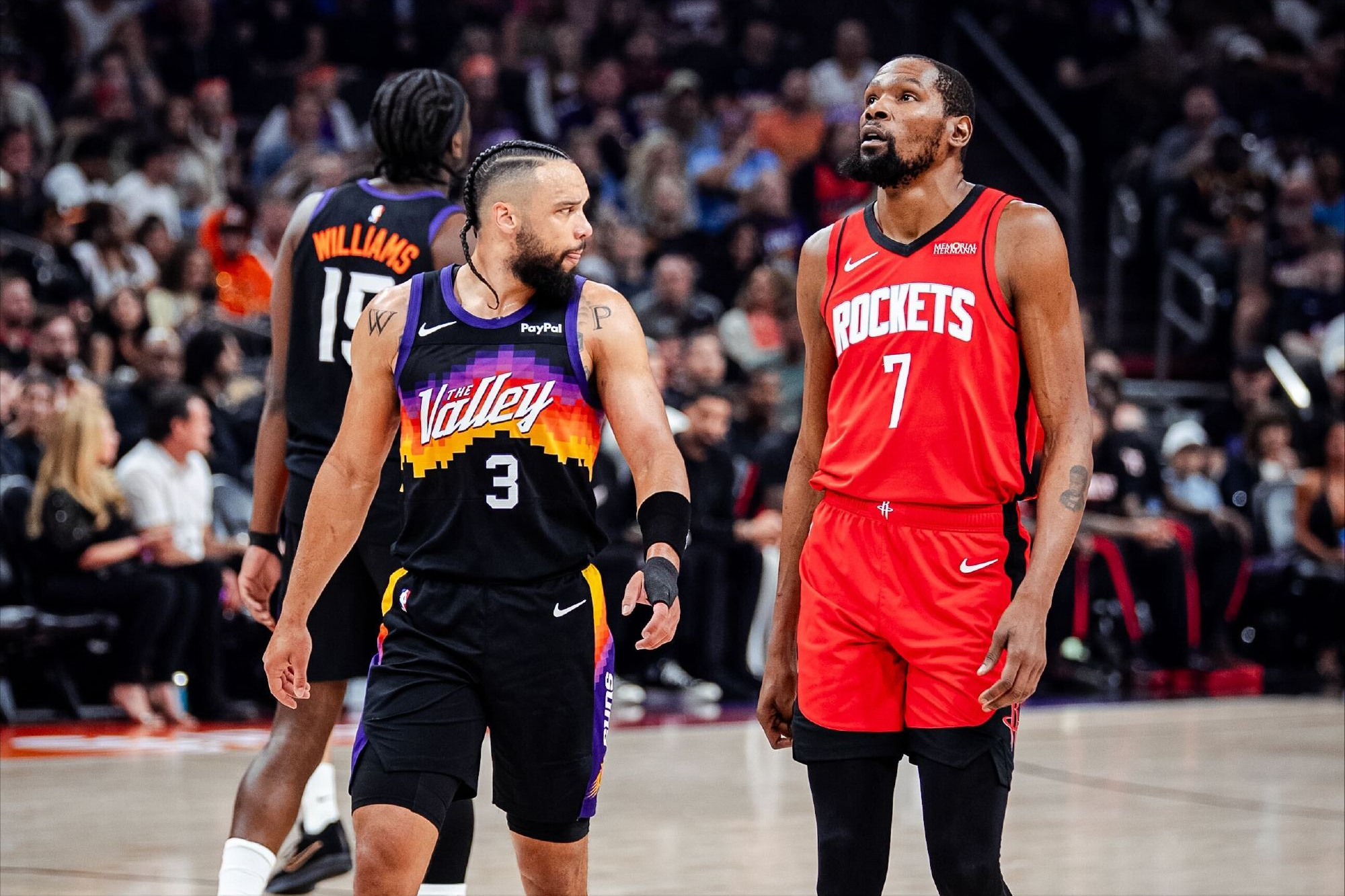 比赛刚开始,火箭队的表现只能用极其糟糕来形容。太阳队手感滚烫,打出了队史自有每回合得分统计以来最强的24-0进攻高潮。全队前15次出手命中10次,前2分钟火箭队在打出5-2领先3分后,后面接近5分钟的时间,火箭队一分未得,而太阳队得到了24分,直接领先21分!而这段时间,火箭队的13次出手只命中2球!次节比赛,火箭队开始调整,首先就是防守端,成功将太阳队的命中率限制在25%。与此同时,进攻端拿到了太阳队首节的剧本,单节三分9投6中,这一节太阳队旧将杜兰特独得11分,帮助球队在半场结束时将分差缩小到3分!